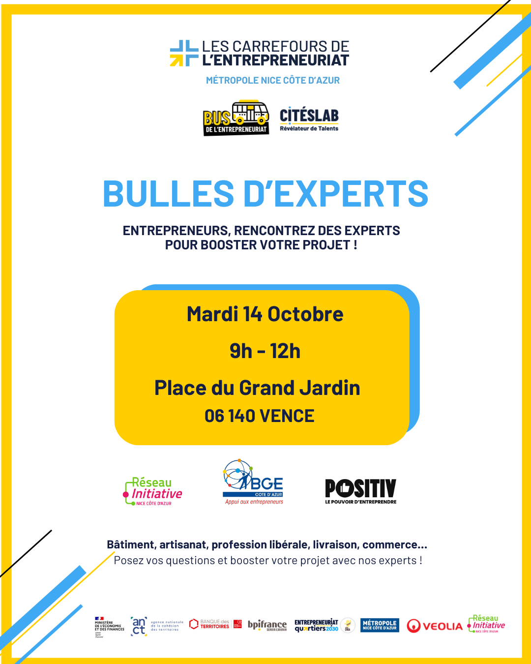 BULLES D'EXPERT - Carrefour de l'EntrepreneuriatMardi 14 octobre 2025Place du Grand Jardin, à Vence ▶ Ouvert à tous |